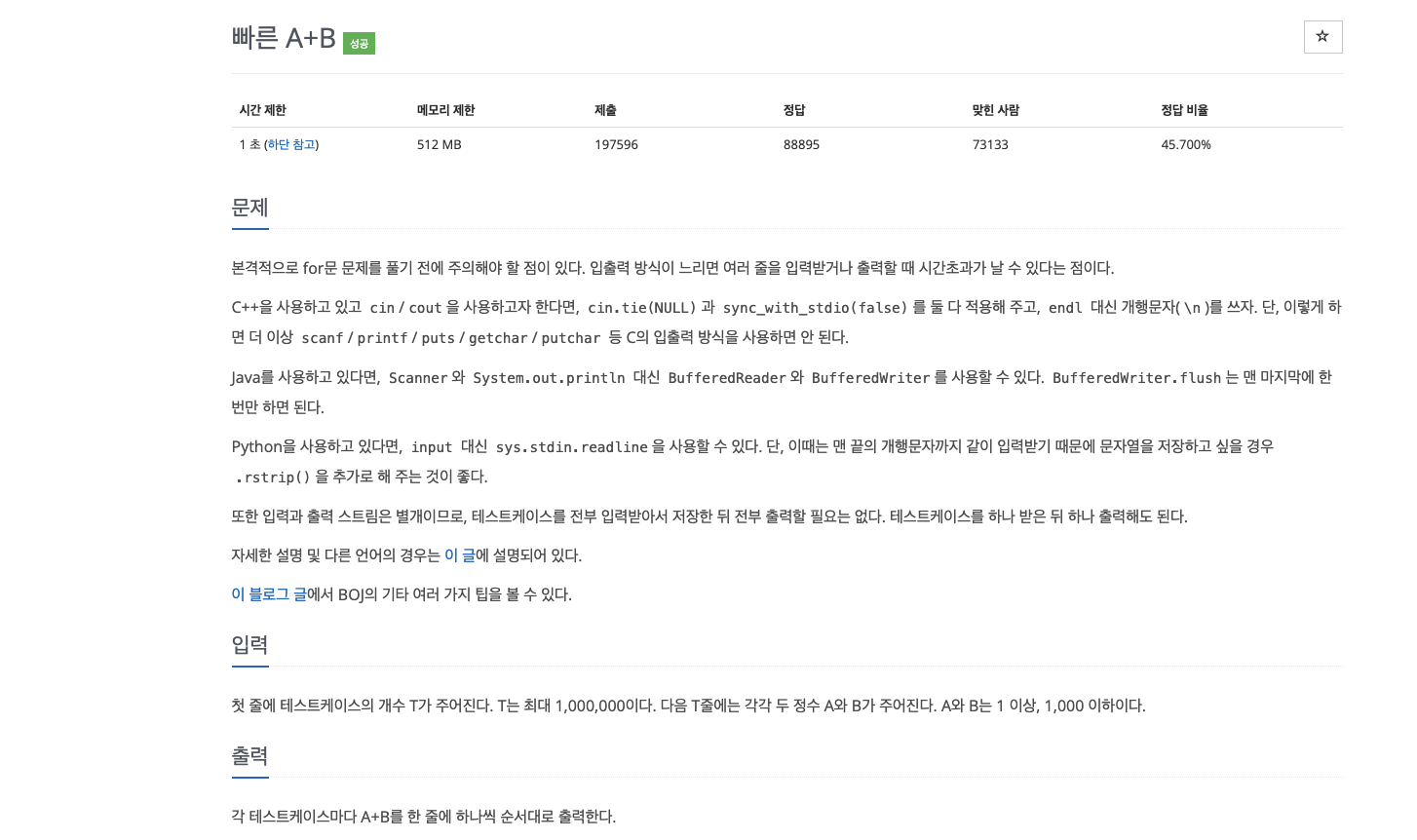 https://www.acmicpc.net/problem/15552 15552번: 빠른 A+B 첫 줄에 테스트케이스의 개수 T가 주어진다. T는 최대 1,000,000이다. 다음 T줄에는 각각 두 정수 A와 B가 주어진다. A와 B는 1 이상, 1,000 이하이다...