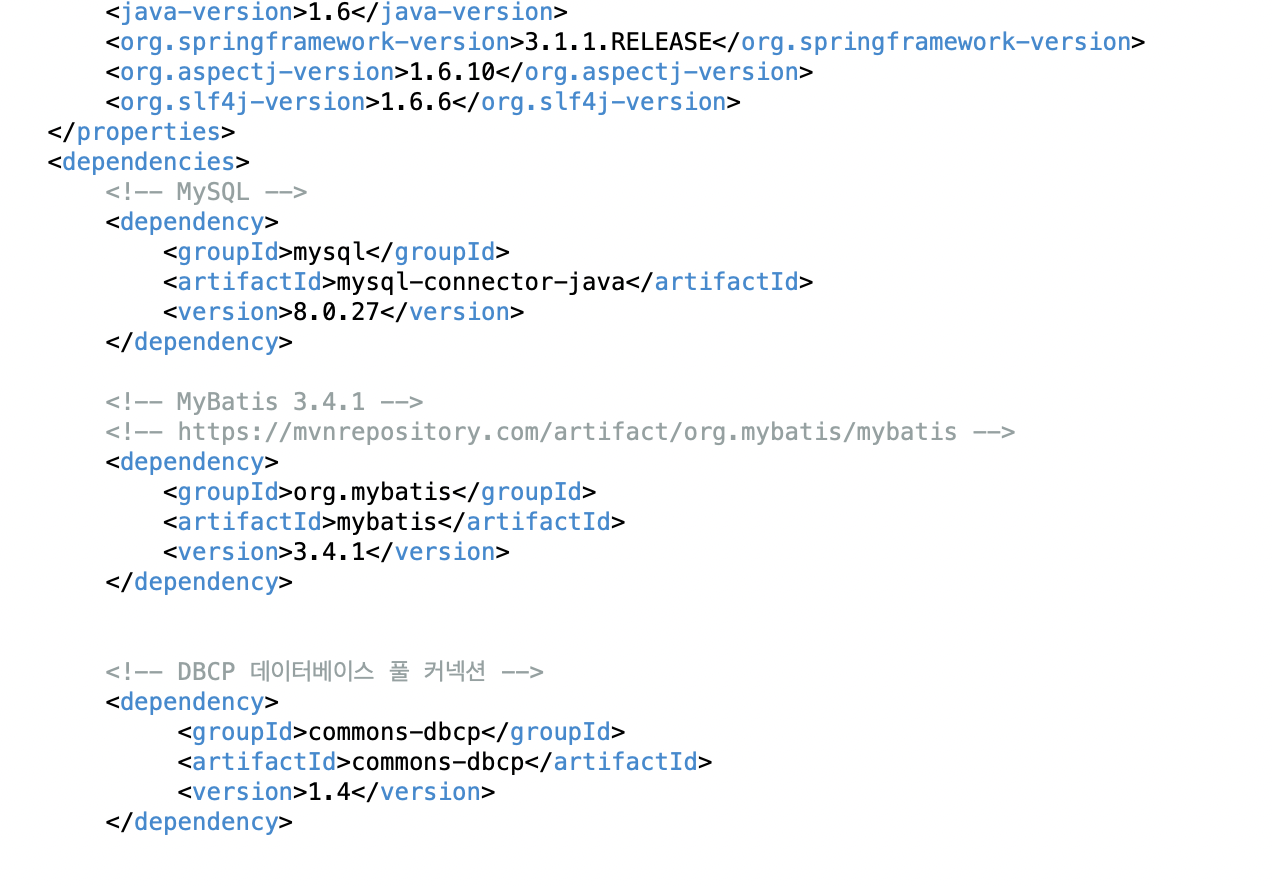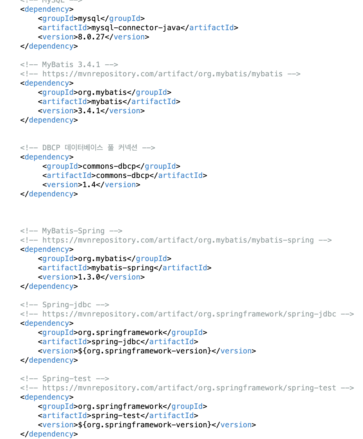 pom.xml에 mybatis와 spring jdbc 코드를 설정해줘서 스프링과 mysql의 연동이 가능하게끔 만들어준다.
