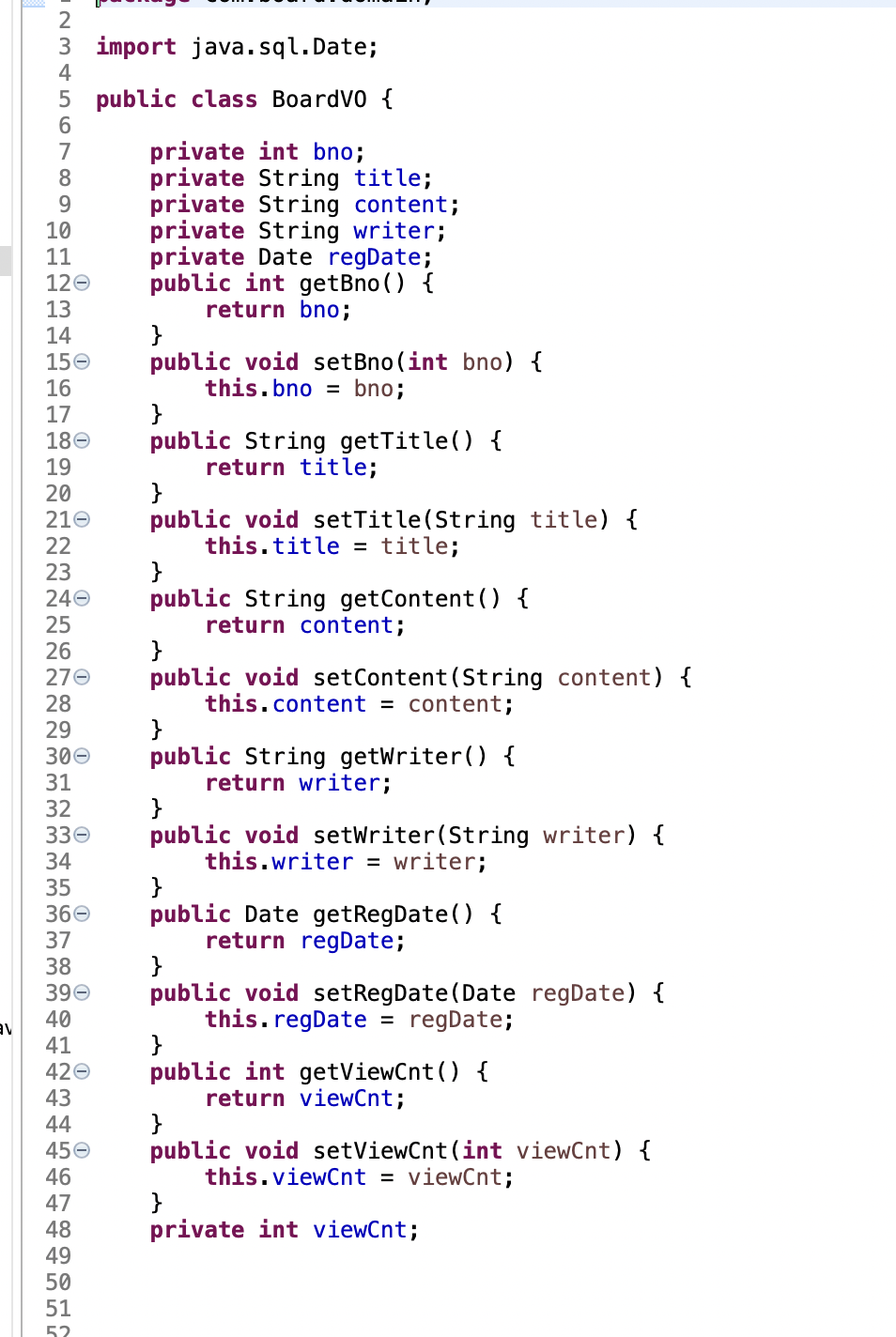 데이터 베이스에서 만든 테이블과 같은 형태의 Value Object를 만들어야 하므로, com.board.domain이라는 pakage를 만든 후, 그 속에 BoardVO 클래스를 생성해주도록 하겠다. 그리고는 모든 변수에 대한 Getter와 Setter 메소드를 구현해주었다. 세터와 게터 메소드가 있어야 데이터를 사용할 수 있으므로, 이 작업은 중요하다!