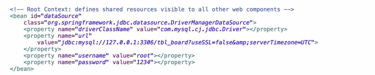 데이터 베이스에서 접속할 수 있도록 bean 코드를 root-context에 추가합니다.