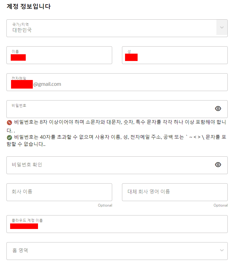 메일에서 주어진 링크로 이동하여 비밀번호와 클라우드 계정이름 그리고 마지막으로 홈 영역으로 South Korea North(Chuncheon)을 넣어주시면 됩니다.