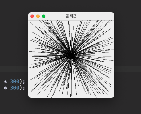 drawLine을 학습하고 있던 도중에 불현 듯 아주 기발한 생각이 났다. ㅋㅋㅋㅋㅋㅋㅋ 바로 난수를 활용해서 엄청 많은 선을 그려보고 싶어진 것이다. x1, y1 좌표는 Frame Size의 half값으로 fix하고, x2, y2 좌표를 반복문을 활용한 난수를 통해서 가운데에서 엄청 많은 선이 뻗어나가는것을 상상하면서 작성했다.