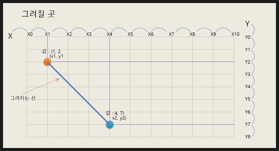 | drawLine | drawLine(int x1, int y1, int x2, int y2) | 좌표(x1, y1)에서 좌표(x2, y2)까지 직선을 그린다. |