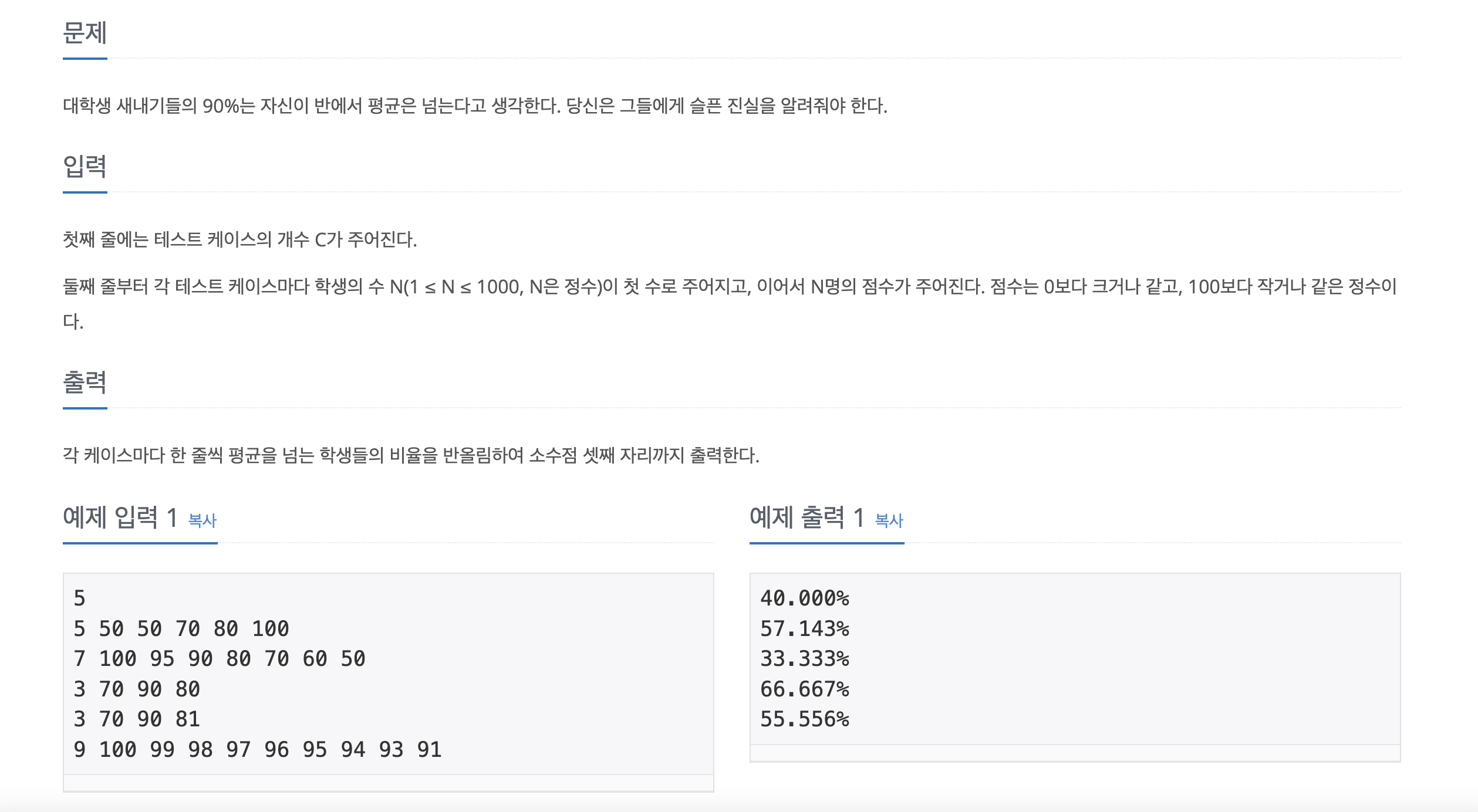 1. 마지막에 예제 출력에 나와 있는 것처럼 소수점 셋째자리까지 출력해야된다.