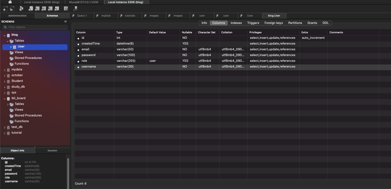 내가 blog 스키마에 만들 user 테이블에는 id, username, password, email, role, createdTime 이렇게 6개의 컬럼을 생성할 예정이다. 이것을 쿼리문으로 작성하면(oracle database 형식)