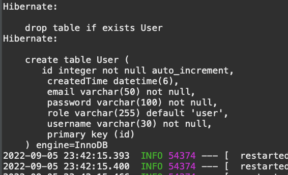 현재는 처음 user 테이블을 만드는 거라 create로 설정을 해뒀지만, 계속해서 create로 설정해놓으면, 컬럼값이 완전히 초기화 되버리니 유념하는것이 좋다!