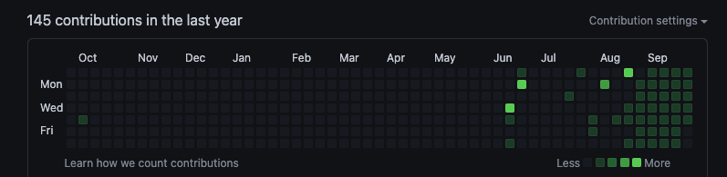 매일같이 개인 프로젝트를 커밋하면서, 깃에 푸쉬해서 나름 1일 1커밋을 훌륭하게 해내고 있었고, 9월30일 마지막날도 친구들과의 약속 때문에 커밋을 미리해놓고, 운동을 마친후에 술을 마시러 나갔었는데. . . 정말 충격적이게도 커밋은 해놓고 푸쉬를 안해서 9월의 마지막 날인 30일날의 contributions가 0으로 책정되어 9월의 한달의 목표였던 1일 1커밋이 실패로 끝났다. 이게 말이되나...? 싶을정도로 엄청나게 실망했다. 나한테... 10월1일이 친한친구의 생일이라 술을 먹으러 나간거까진 오케이.. 그것때문에 미리 운동도하고, 커밋도 땡긴거 오케이... 근데 왜 푸쉬를 안했으며,, 술자리 내내 깃을 생각하지 않았던 것일까.. 굉장히 아쉽지만.. 10월달은 꼭 놓치지 않고 모든 커밋을 완료하도록 하겠다..ㅜㅜ