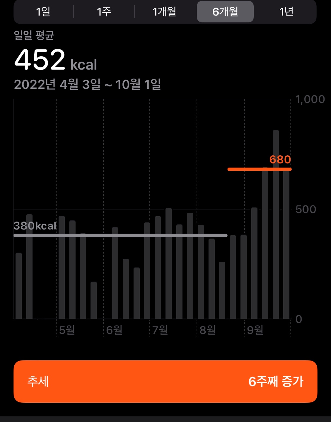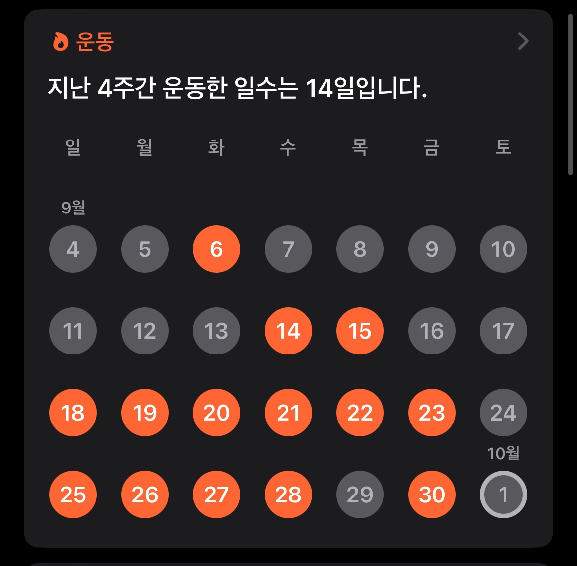 다만 아쉬운점은 9월 초반의 운동데이터를 모으지 못해서(애플워치 미착용 . . .) 10월에는 꼭 모든 날의 운동데이터를 모아 예비 개발자(?)답게 데이터 분석을 통한 수치계산으로 정확한 결과값을 산출해보도록 하겠다.